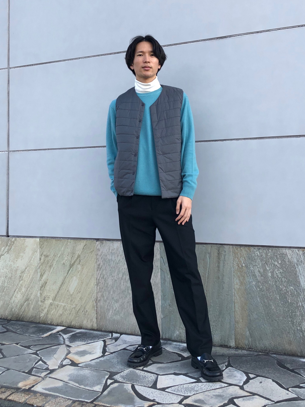 ヒートテックウォームパデッドベスト ローゲージvネックカーディガン 長袖 の着用コーディネート ユニクロ